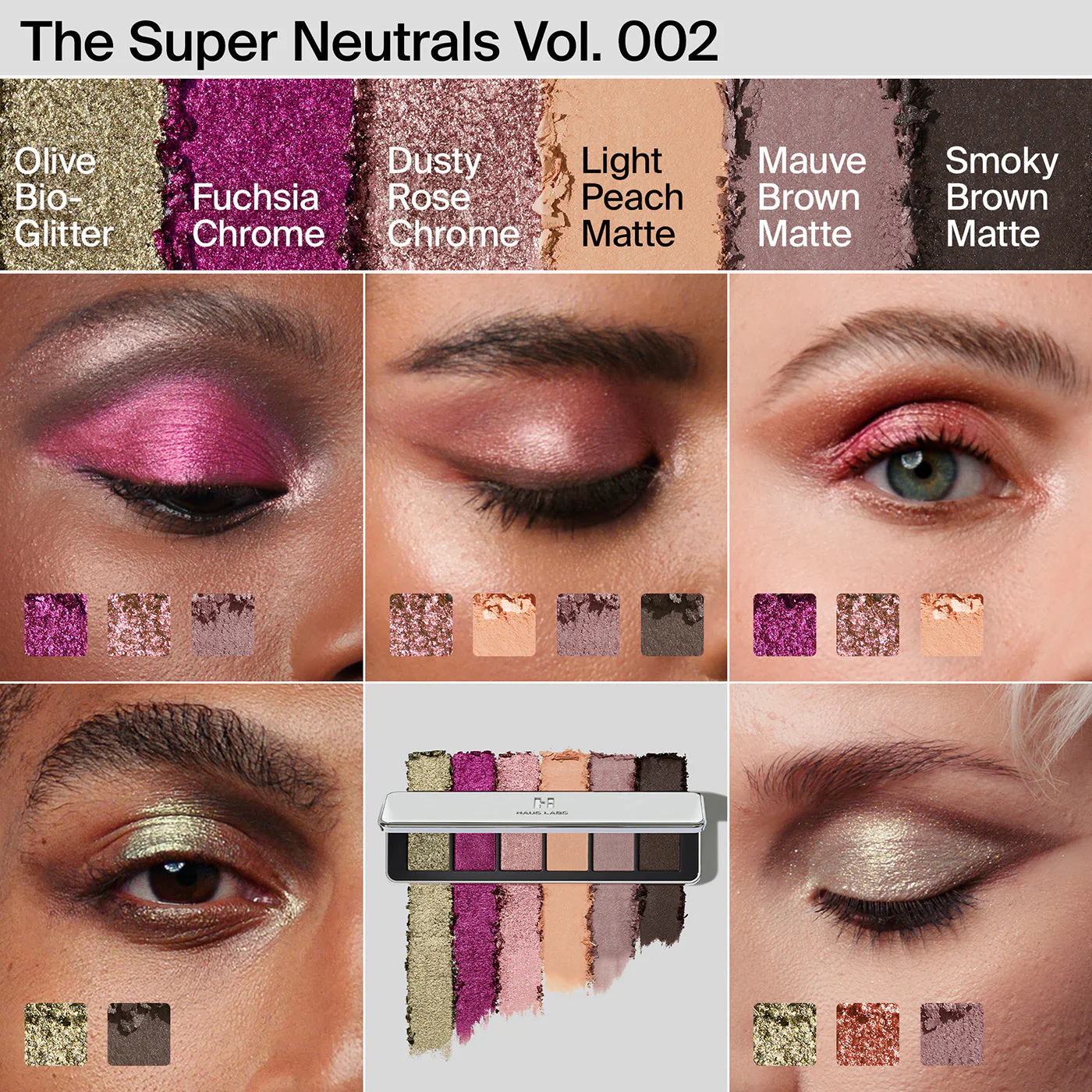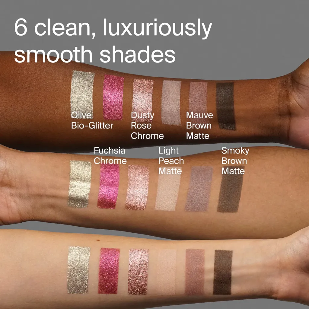 - Vol. 002: 6 x 0.18 oz / 5g Eyeshadows in Olive Bio-Glitter, Fuchsia Chrome, Dusty Rose Chrome, Light Peach Matte, Mauve Brown Matte, Smoky Brown Matte