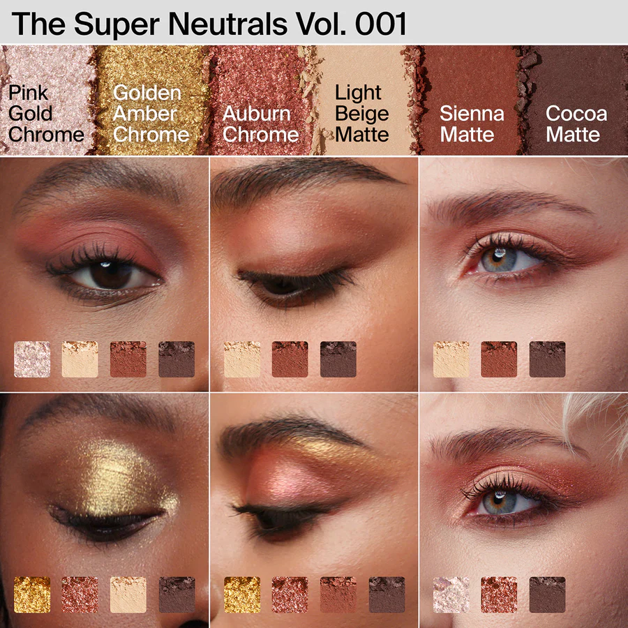 - Vol. 001: 6 x 0.18 oz/ 5 g Eyeshadows in Pink Gold Chrome, Golden Amber Chrome, Auburn Chrome, Light Beige Matte, Sienna Matte, Cocoa Matte