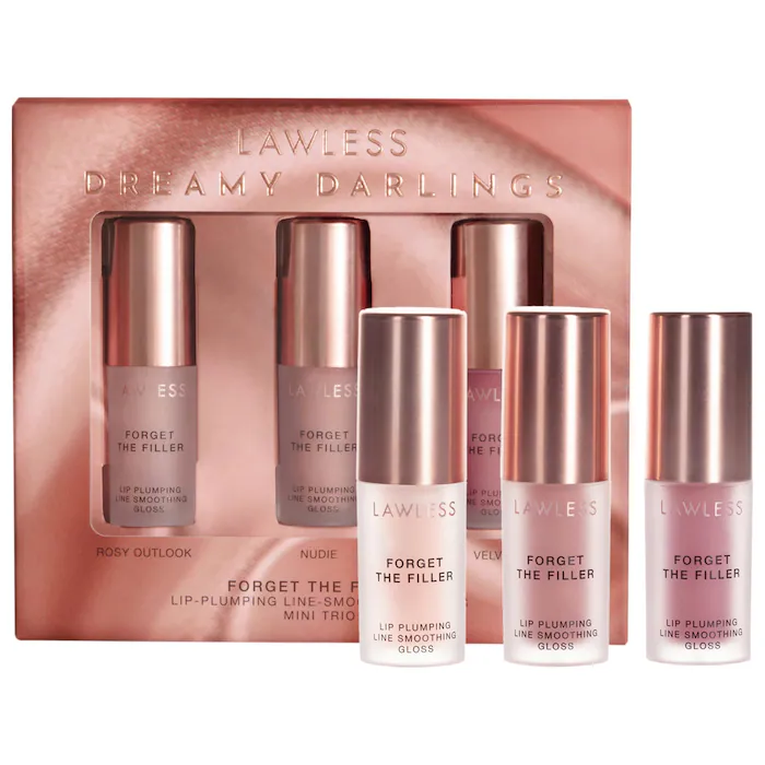 - Мини-блески для губ Forget The Filler Lip Plumper Line Smoothing Glosses в оттенках Rosy Outlook (супер светлый розовый), Nudie (розовый нюд с перламутровым финишем), Velvet (розово-лиловый с плюмовым подтоном)
