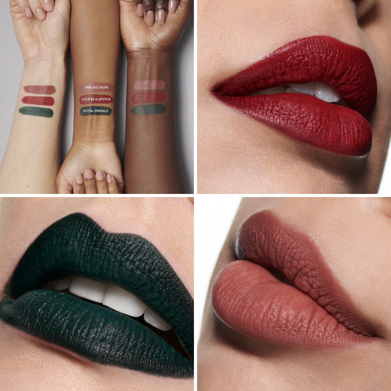 - Оттенки: Timeless Taupe - коричневато-нюдовый, Luck Be A Lipstick - насыщенный красный, Royal Emerald - изумрудно-зеленый.
