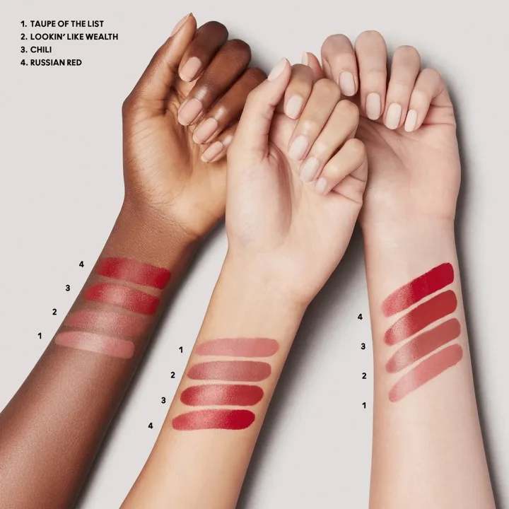 Кремовая матовая губная помада новых и самых продаваемых оттенков с высокой цветопередачей, заключенная в специальную упаковку с красным лаком в стиле омбре.