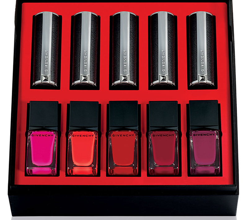 В коллекцию Givenchy Holiday Red 2018 вошли:Цветные помады для губ+ набор лаков для ногтей - $ 295.00Губная помада: Начните с определения контуров губ. Используя кончик пальца, аккуратно размывайте лайнер по направлению к внутренней стороне губ, затем заполните Le Rouge от центра.Лак для ногтей: наносите длинные широкие штрихи, начиная с центра ногтя, затем перемещаясь в стороны. Уделите достаточное время для сушки (около пяти минут) между слоями для достижения наилучших результатов.Набор включает в себя: