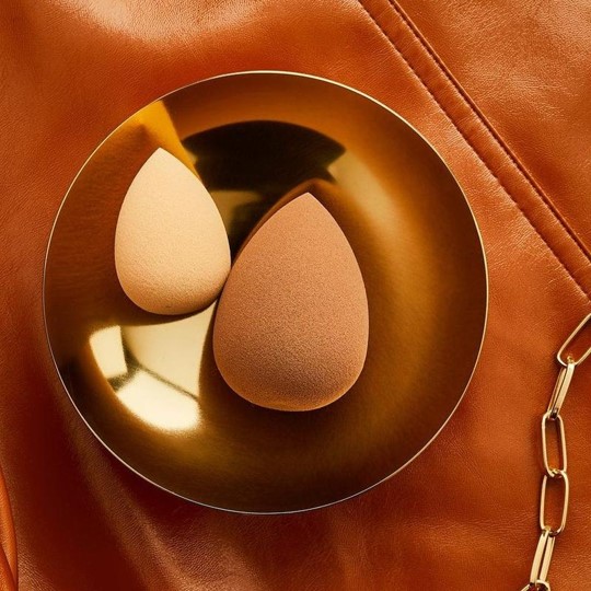 Глянцевые ручки кисти в карамельном тоне элегантно заострены и отделаны блестящими золотыми деталями и логотипами. Они упакованы в мешочек EVA многоразового использования, как и дуэт спонжей без латекса.