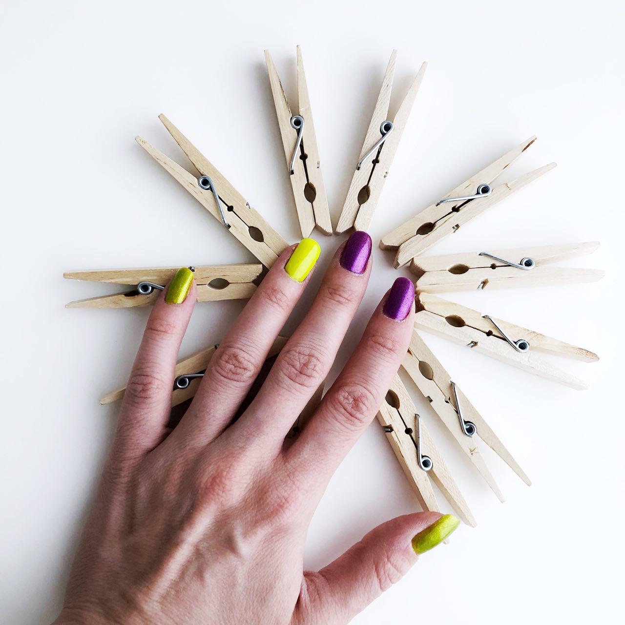 Я точно не могу сказать и не помню как мне в голову пришла такая идея, но я взяла обычные бельевые прищепкиIt seems awful now. But many years ago it was in fashion. I don’t like my nail shape. They were like a “shovel” and looked ugly. I can’t say for sure and don’t remember how such an idea came into my mind. I took usual clothespins и сделала вот так:and did like this: