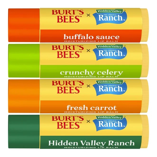 Набор бальзамов для губ Burt's Bees x Hidden Valley Ranch Dippers Lip Balm, который включает в себя бальзам со вкусом соуса баффало и три других вкуса, включая Hidden Valley Ranch, Crunchy Celery и Fresh Carrot!