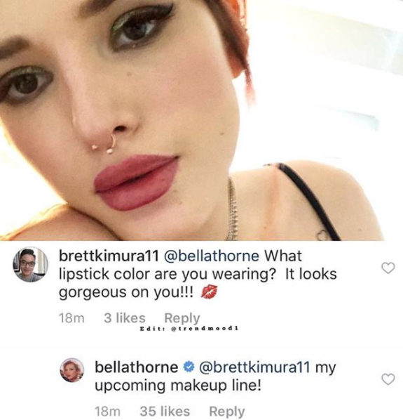 Недавно Торн спросили о помаде, которая была на ней. На что девушка заявила, что это помада из ее собственной линии. Больше никаких комментариев не поступало.