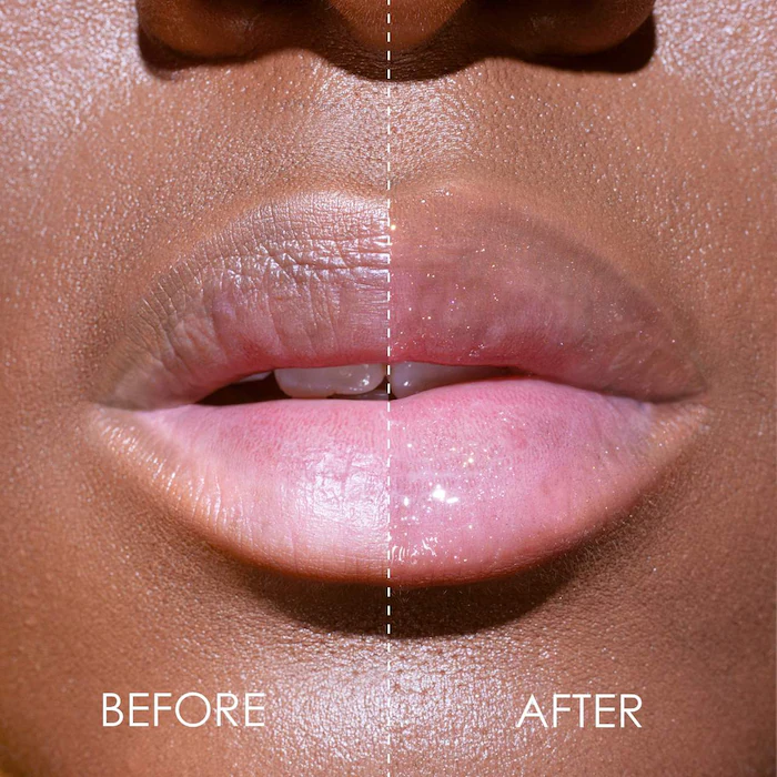 Невесомое масло-блеск с золотистыми блестками создает сочный, пухлый контур губ с зеркальным блеском.