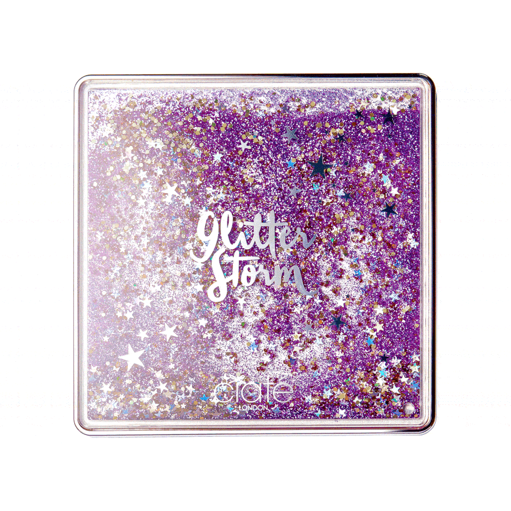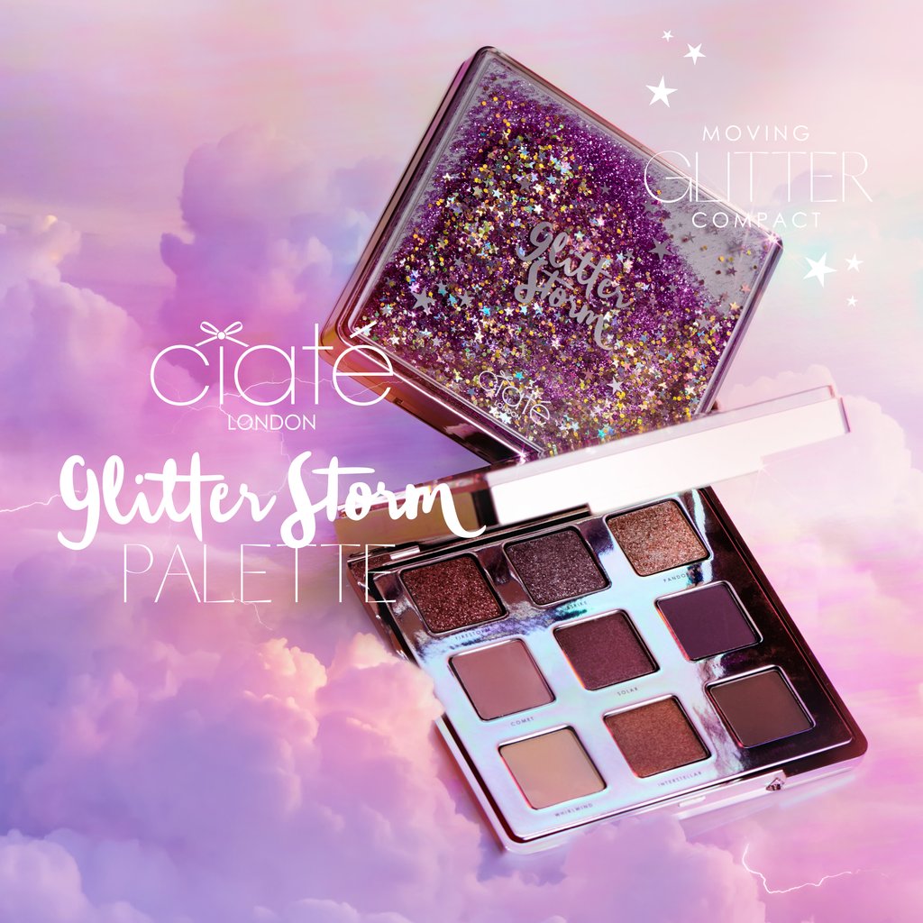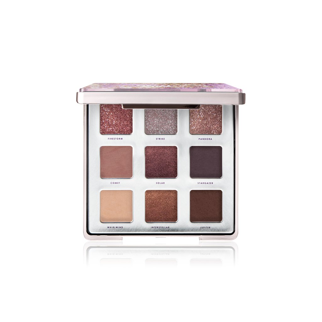 Glitter Storm Eyeshadow Palette –новая палитра теней в сияющем исполнении. Цвета выбраны в фиолетовой гамме, самой актуальной в 2018 году. Палетка представляет собой микс из сочетания различных текстур: прессованных с блестками, спокойных матовых и расплавленных металликов. Набор состоит из девяти оттенков, которые гармоничны между собой.