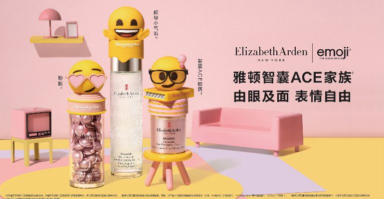 Elizabeth Arden сотрудничает с брендом Emoji в рамках новой коллаборации. Подарочная коробка и новая упаковка созданы для продвижения крема для век ACE, розовых капсул и микроэссенции керамидов в Китае.