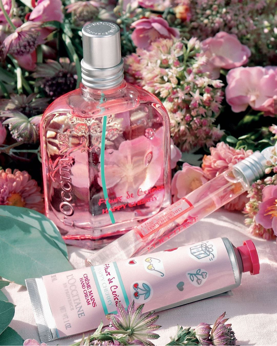 Традиционные ароматы Cherry Blossom, выпускаемые ежегодно в рамках коллекции Cerisier французского дома L'Occitane en Provence, празднуют начало весны и прелесть цветения вишневого дерева. Туалетная вода Fleurs de Cerisier Happy Cherry вновь приносит радость благодаря неотразимым пудровым, сладким, слегка острым ароматам вишневых цветов и сладким, насыщенным и терпким ароматам фруктов. Коллекция выполнена в светлых тонах, сочетая бледно-розовые и непрозрачные синие цвета для упаковки.