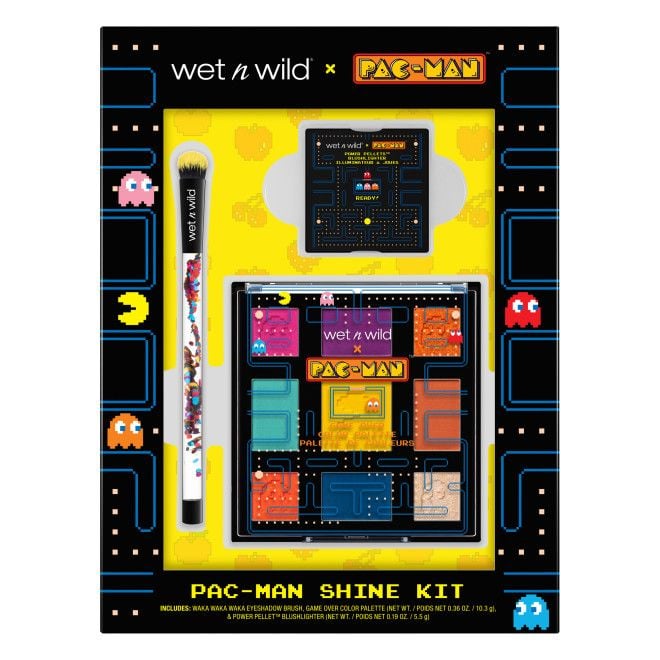 Wet N Wild PAC-MAN Shine Kit – набор, включающий в себя кисть для нанесения теней, палетку теней и хайлайтер.