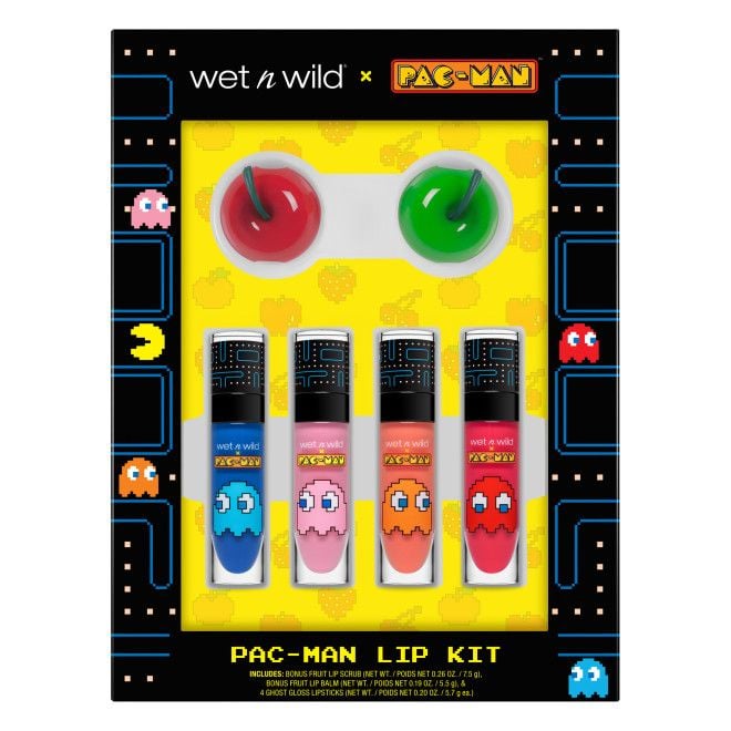 Wet N Wild PAC-MAN Lip Kit – набор, включающий в себя четыре оттенка блесков для губ, фруктовые бальзам и скраб для губ.