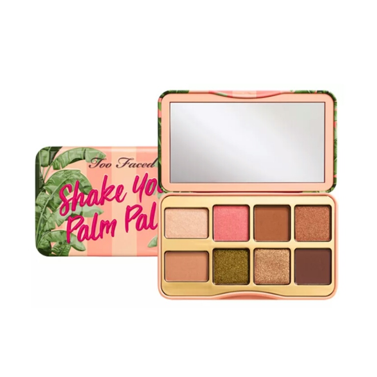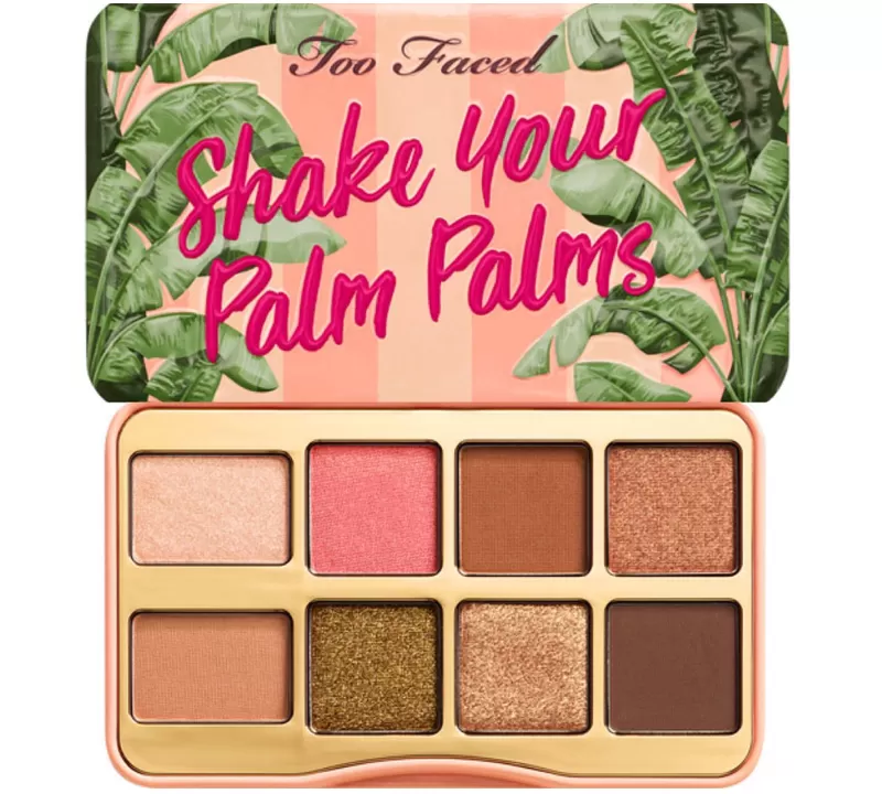 Too Faced Shake Your Palm Palms - ограниченное издание Будет ли эта палетка частью новой коллекции косметики? Shake Your Palm Palms обладает нейтральными оттенками в матовой, мерцающей и жемчужной отделках. Аромат - прекрасное сочетание персиков и сивок. Формула настаивается с персиковым и сладким инжирным молоком. Это безусловно пахнет идеальными летними каникулами, на которые мы бы отправились прямо сейчас. Если вы задаетесь о размере палетки, убедитесь, что вы можете легко упаковать ее с собой в любой багаж или сумку, поскольку это удобный формат для путешествий.