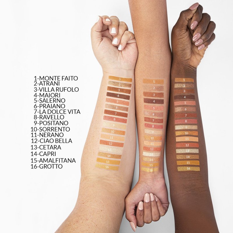 Живите "La Dolce Vita" с Amore in Amalfi, захватывающим веганским набором шелковисто-гладких матовых и блестящих шиммеров в бронзово-золотых, насыщенных коричневых и закатных нейтральных оттенках. Каждый оттенок обладает высокой степенью насыщенности и стойкостью, которая будет сохраняться на протяжении всего времени пребывания на кристально голубых пляжах и очаровательных виллах на скалах.