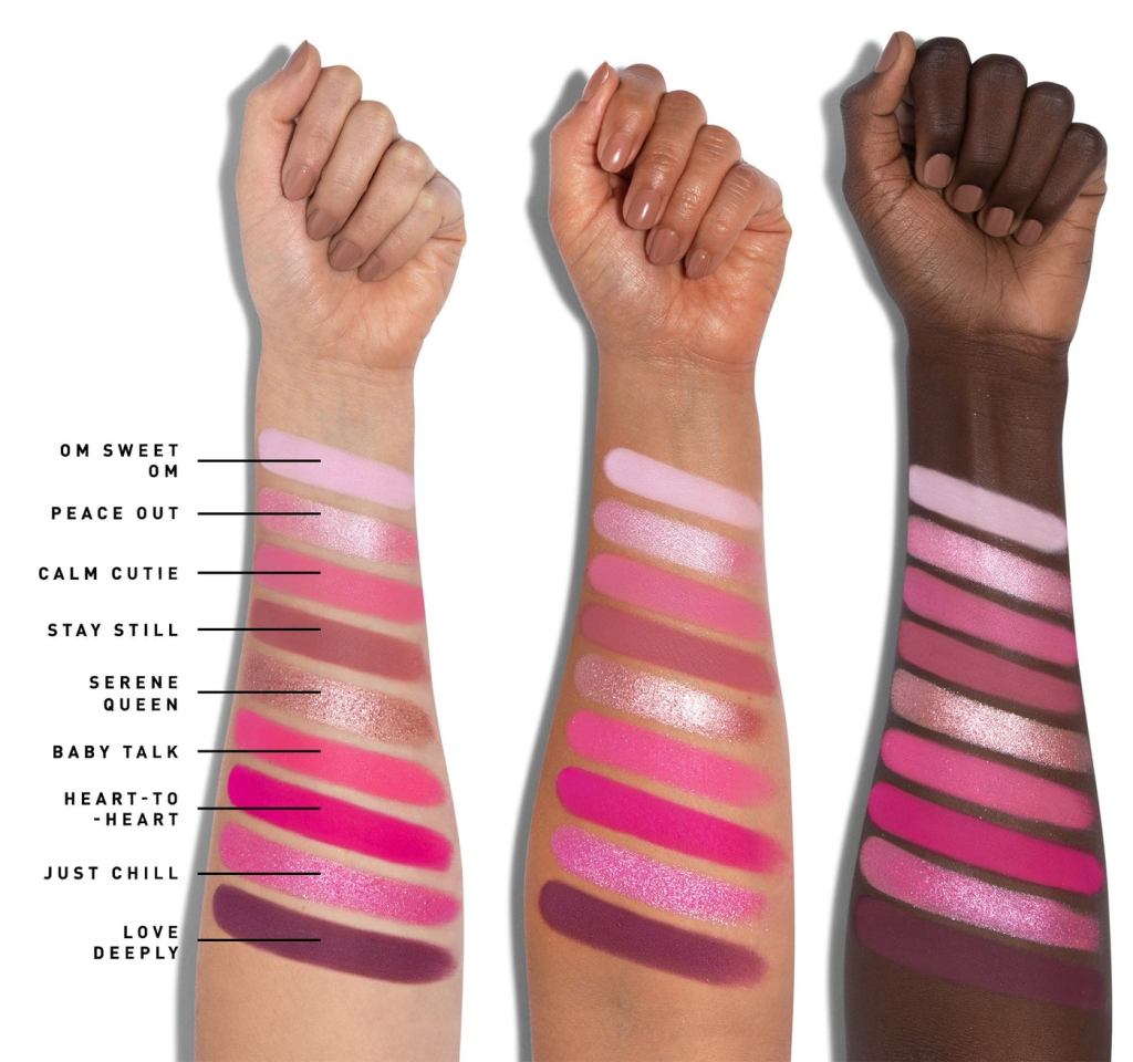 - Верхний ряд: Om Sweet Om (матовый розовый с блеском), Peace Out (розовый с блеском), Calm Cutie (матовый румянец).