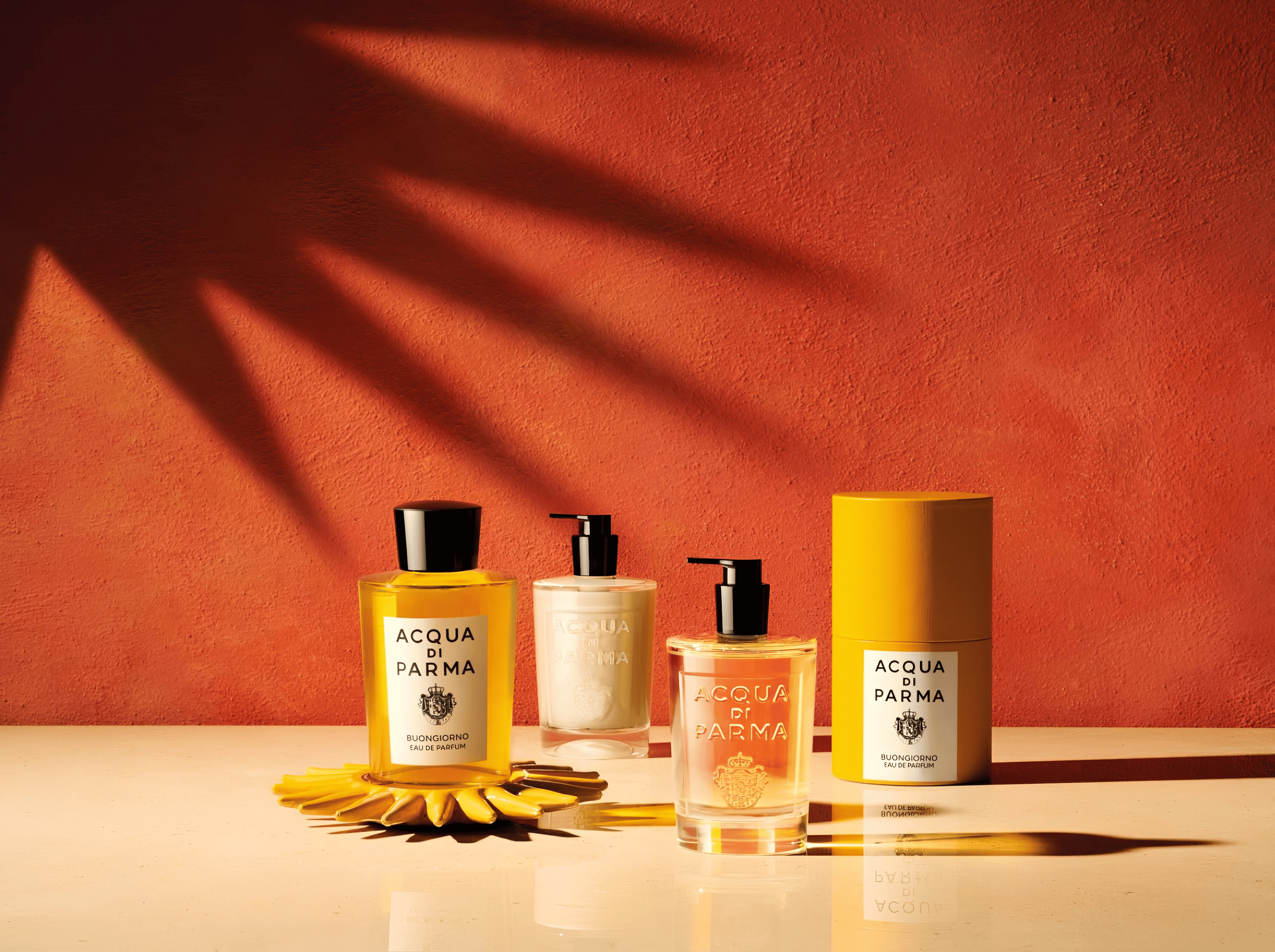 Яркий желтый флакон Buongiorno отражает солнечный настрой аромата и светлую сущность весны и фирменный итальянский стиль Acqua di Parma. Дизайн не только дополняет аромат, но и привносит нотку солнечного света в любое пространство.