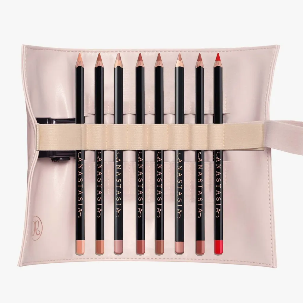 Набор Deluxe Mini Lip Liner Set включает восемь мини-помад для губ и точилку для карандашей 3 в 1. Все они помещены в индивидуальный ABHBrushRoll, который идеально подходит для хранения этих средств для губ в дороге. Каждый мини-карандаш для губ обеспечивает точную форму, контурирование и растушевку, а его квадратная форма позволяет заточить его до тонкого острия, что обеспечивает исключительную точность. Кремообразная (но не блестящая и не скользкая) формула скользит по губам, создавая бархатно-матовое покрытие. Высокоэффективную формулу можно наносить на все губы для стойкого бархатисто-матового эффекта.
