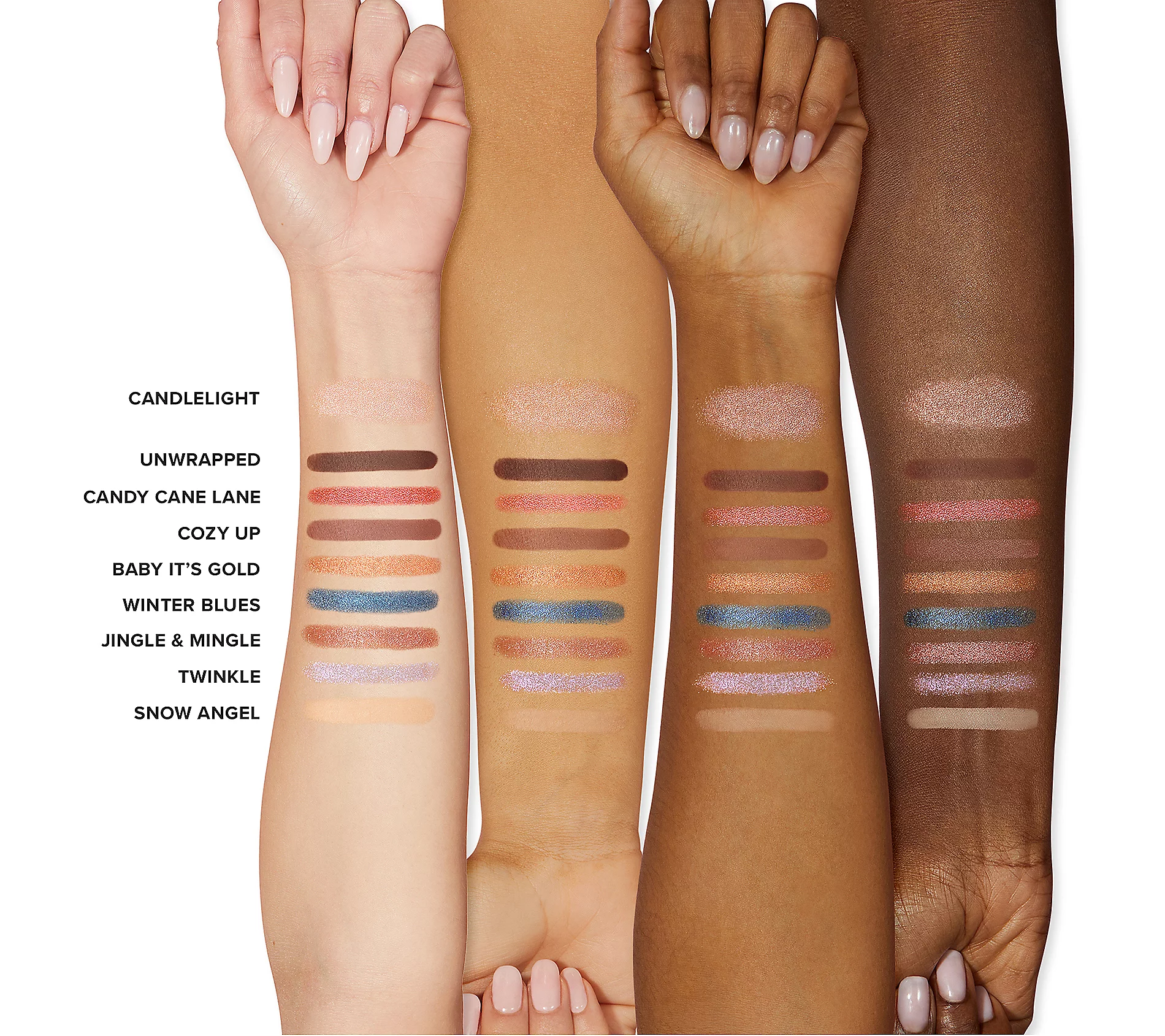 - Палетка для лица и глаз Holiday Angel с оттенками Snow Angel, Twinkle, Jingle and Mingle, Winter Blues, Baby It's Gold, Cozy Up, Candy Cane Lane, Unwrapped и Candlelight