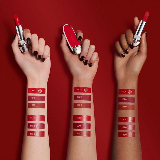 - 1870 Rouge Imperial - насыщенный ягодно-красный цвет. Этот оттенок был использован для первой помады Guerlain в стике: Ne M'oubliez Pas. Насыщенный, слегка голубоватый тон, когда-то очень ценимый аристократией 19 века, является данью уважения императрице Евгении и вдохновлен тканями, которые носили королевские особы.