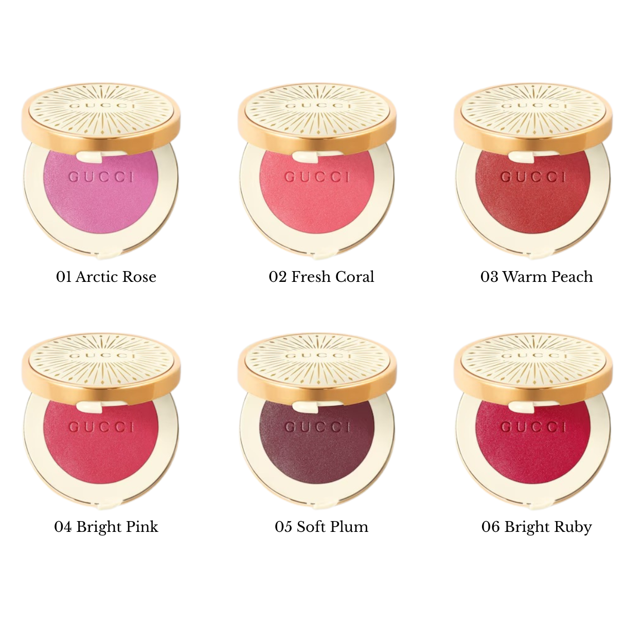 Новые румяна Gucci Glow Blush добавляют свежесть в макияж, подчёркивая естественную красоту кожи сияющим финишем. Гибридная кремово-пудровая текстура буквально тает на коже, даря влажное, перламутровое свечение с шелковисто-мягким ощущением. Формула легко наслаивается и отличается высокой стойкостью, создавая эффект «второй кожи» — от лёгкого румянца до более насыщенного цвета.