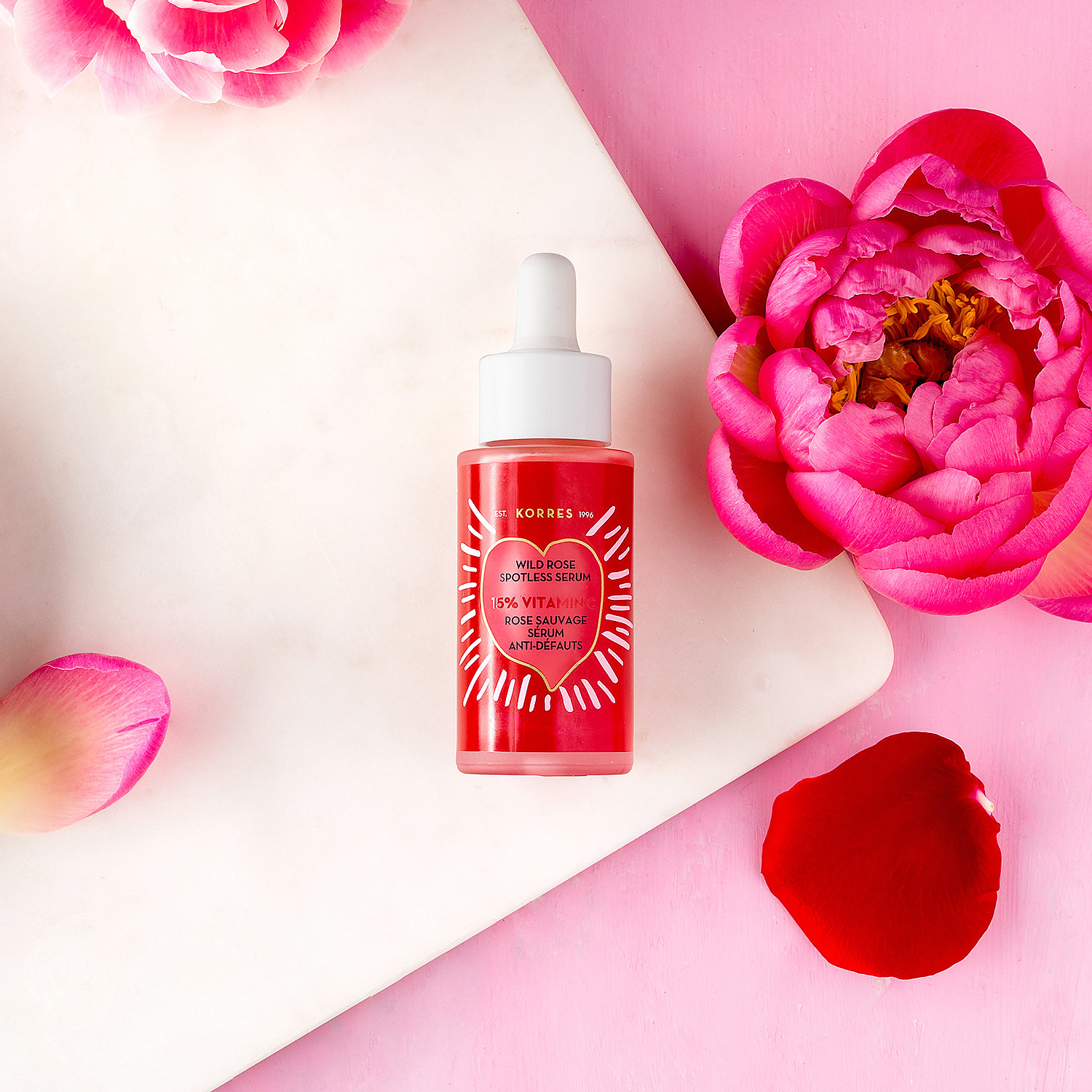 Кроме поэтической составляющей, это еще и очень важный ингредиент в составе косметических средств. Korres решили использовать розу в качестве ключевой фигуры в составе. Сыворотка Wild Rose 15% Vitamin C Spotless Serum соединила в себе все, что так необходимо коже. Основная задача сыворотки – усиленная работа с тоном кожи.