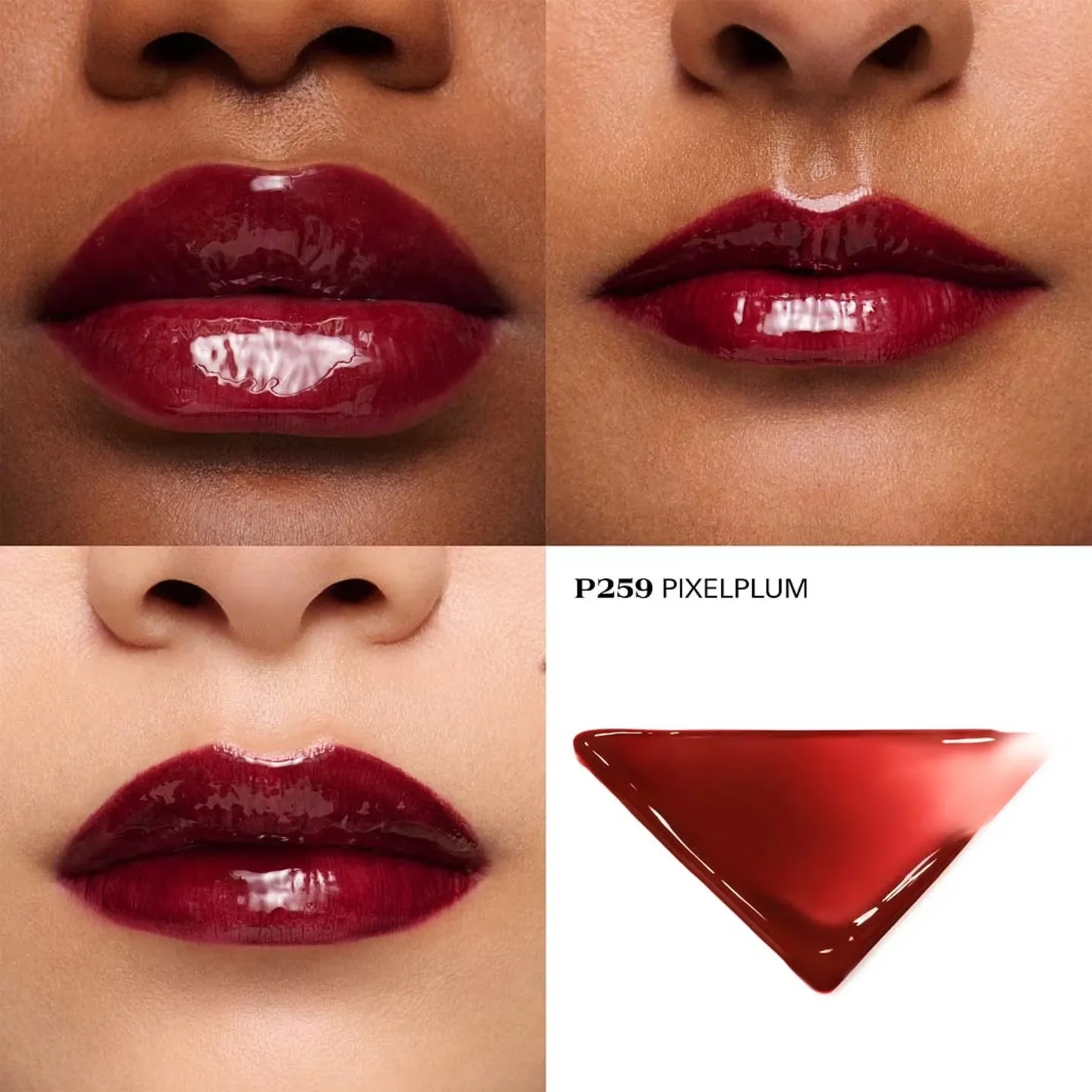 - P259 PIXEL PLUM — холодный подтон, объединяющий глубокую сливу с технологичной эстетикой Prada