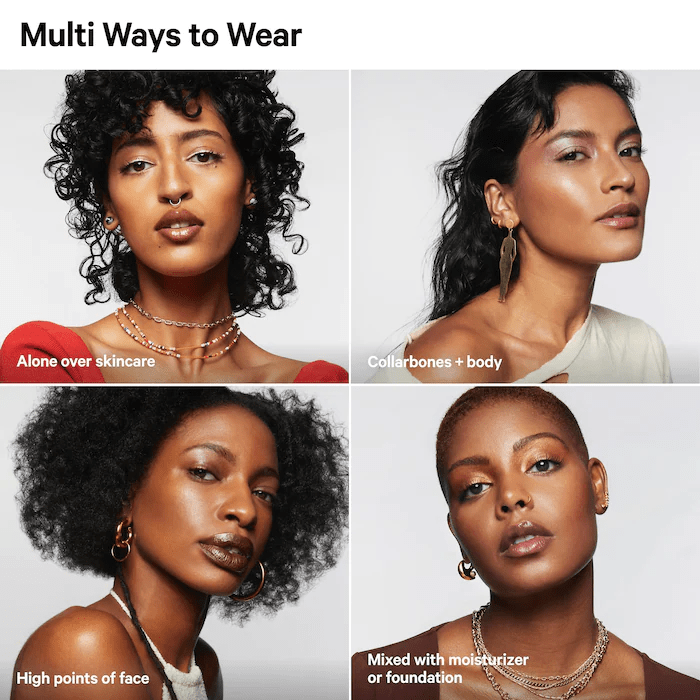 Жидкий хайлайтер с полезными свойствами для кожи, который можно наносить на лицо и тело или смешивать с увлажняющим или тональным кремом для придания естественного сияния.