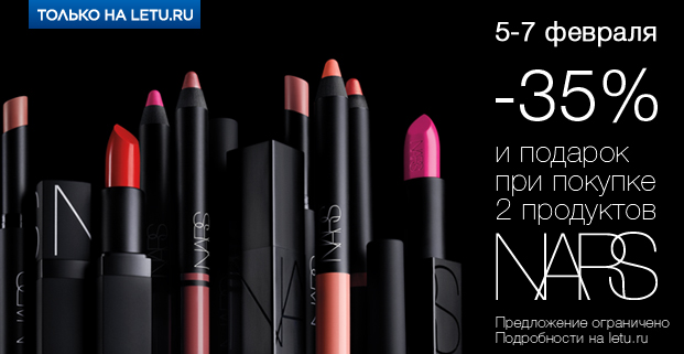 Условия акции: скидка -35% действует на бренд NARS в интернет-магазине Л'Этуаль. При покупке двух продуктов, вы получаете подарок от бренда. Подробнее об акции здесь!Действие акции: с 05.02.2018 по 07.02.2018Перейти к покупкам!