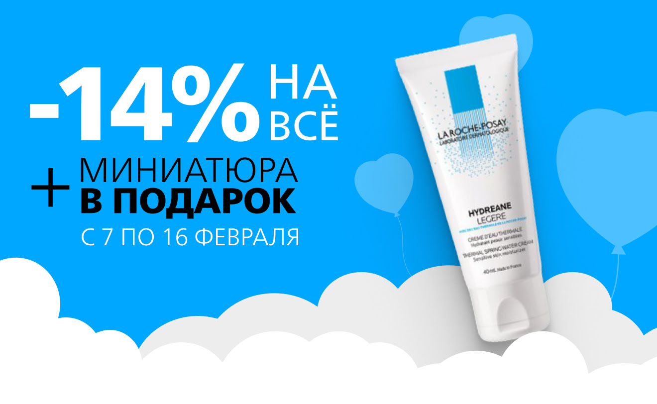 Условия акции: миниатюра в подарок и скидка -14% на весь ассортимент в интернет-магазине La Roche-Posay.Промокод: LOVEДействие акции: с 07.02.2020 по 16.02.2020