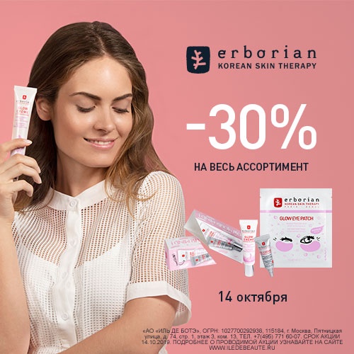 Условия акции: скидка -30% действует на весь ассортимент бренда Erborian при покупке в интернет-магазине Иль де Ботэ.Действие акции: только 14.10.2019 до 23:59 по московскому времени.Подробнее об акции.
