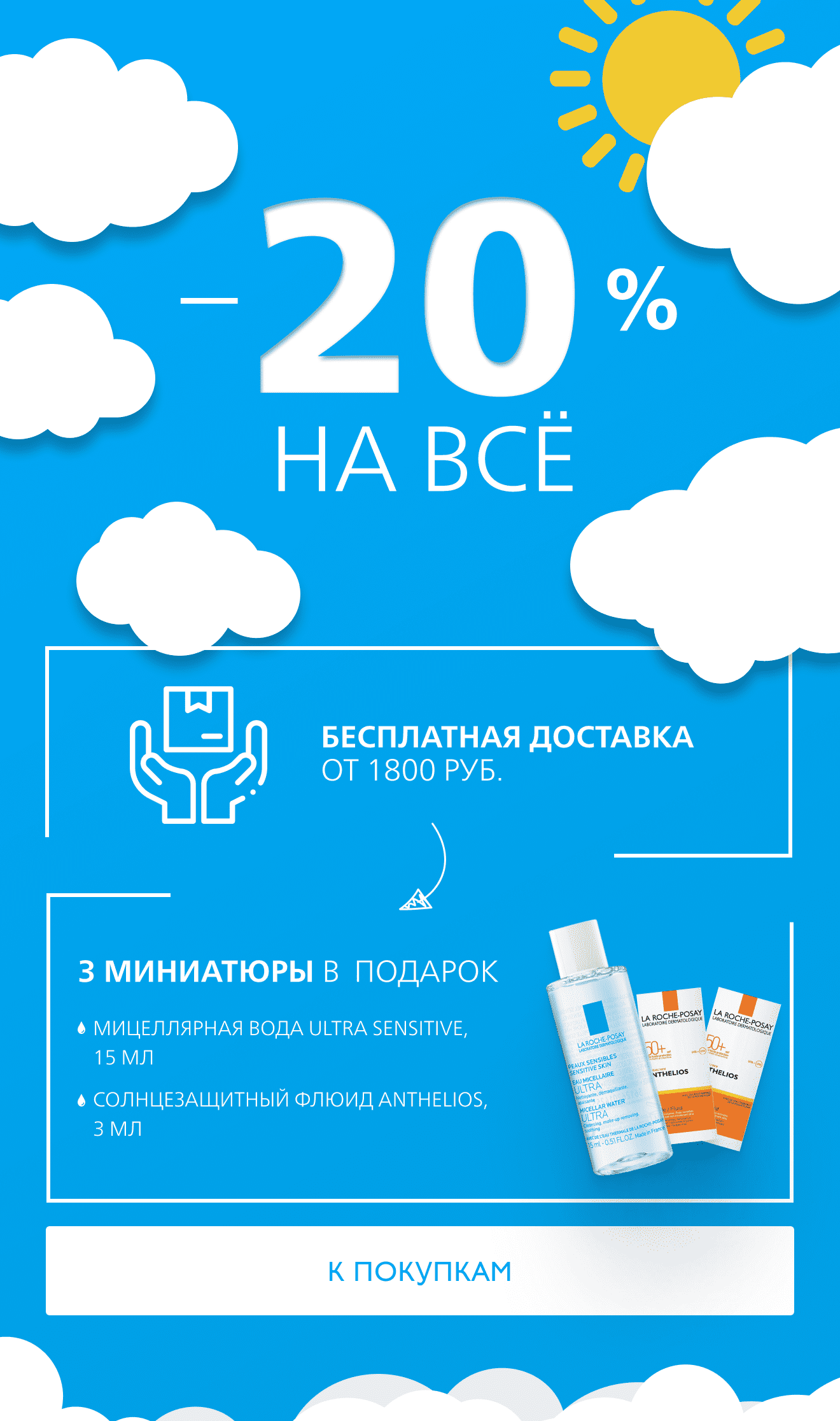 Условия акции: скидка -20% действуе на все и бесплатная доставка при заказе от 1800₽ в интернет-магазине La Roche-Posay.Действие акции: с 23.06.2020 по 30.06.2020