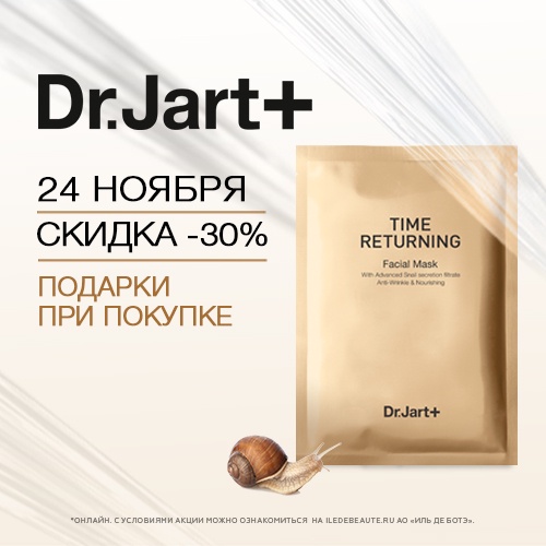 Условия акции: скидки -30% на весь ассортимент бренда Dr.Jart+, подарки при покупке от 1800 рублей в интернет-магазине Иль де Ботэ.Действие акции: только 24.11.2018 до 23:59 по моск.времени.Подробнее об акции.