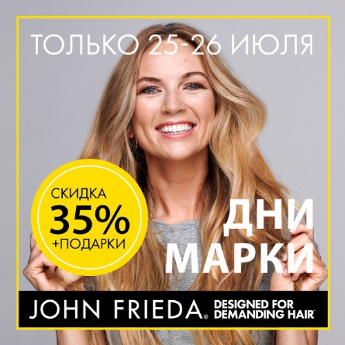 Условия акции: скидка -35% действует на весь ассортимент бренда JOHN FRIEDA в интернет-магазине Иль де Ботэ.Действие акции: с 25.07.2019 по 26.07.2019Подробнее об акции.