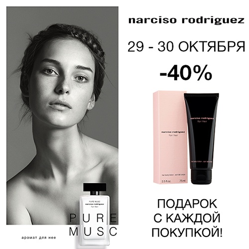 Условия акции: скидка -40% действует на продукцию бренда NARCISO RODRIGUEZ при покупке в интернет-магазине Иль де Ботэ.Действие акции: с 29.10.2019 по 30.10.2019Подробнее об акции.