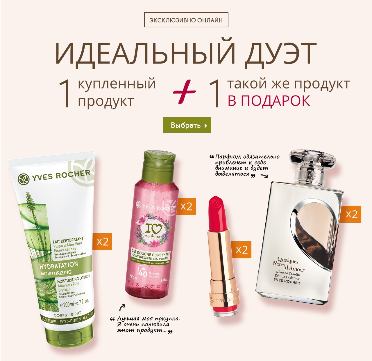 Предложение «2=1 на специальную селекцию продуктов» действительно до 21 сентября 2018 г. при покупке продукта такой же продукт в подарок при заказе в интернет-бутике Yves Rocher.