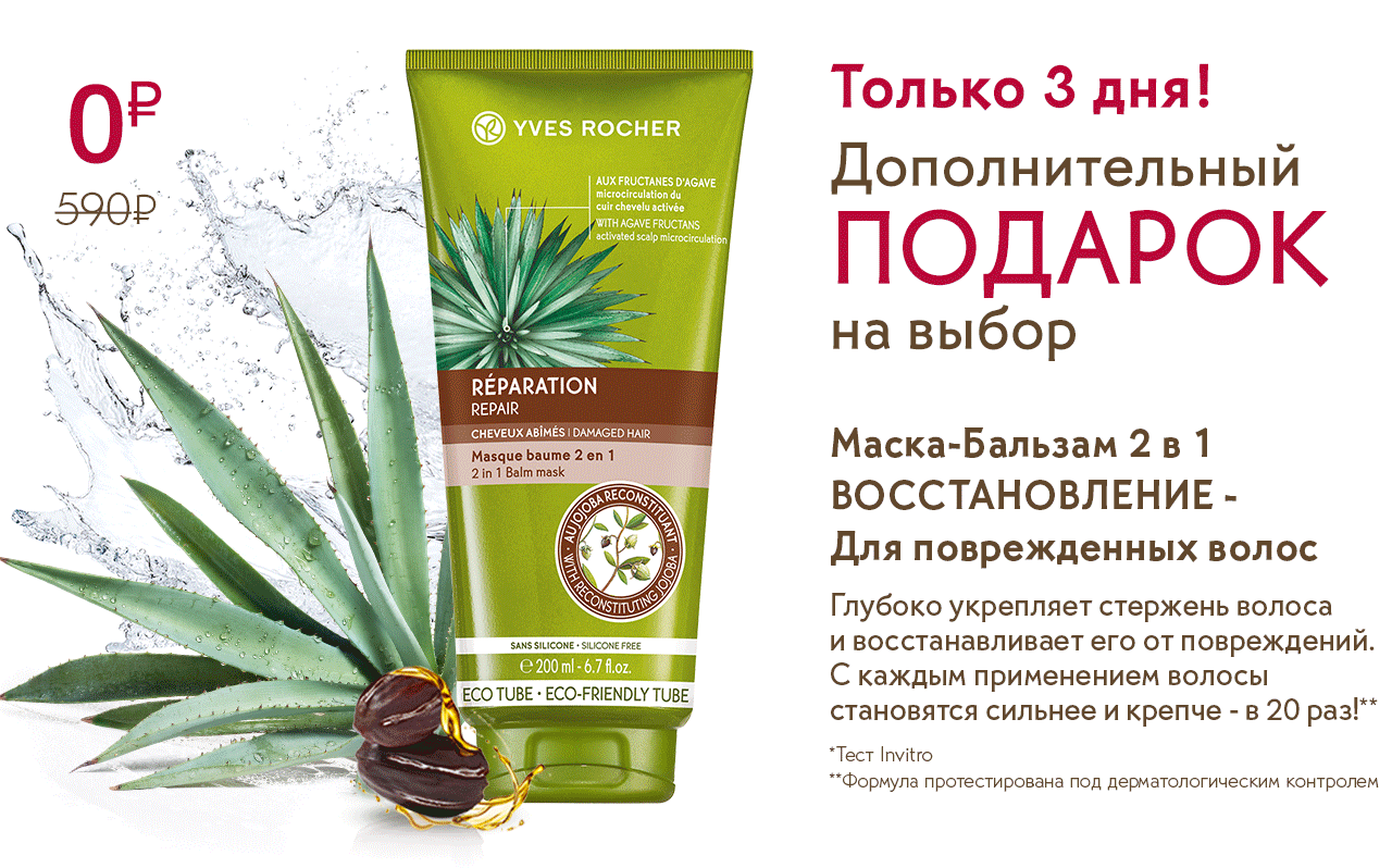 Предложение «Дополнительный подарок за заказ» действительно до 26 апреля 2020 г., в интернет-магазине Yves Rocher.Промокод: HAIR