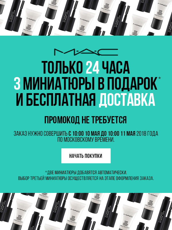 545 0 Условия акции: при любом заказе в интернет-магазине MAC действует бесплатная доставка + 3 миниатюры в подарок.Действие акции: с 10.05.2018 по 11.05.2018Перейти к покупкам! 12.05.2018 Автор статьи: Мария Владимирова Поделиться с друзьями