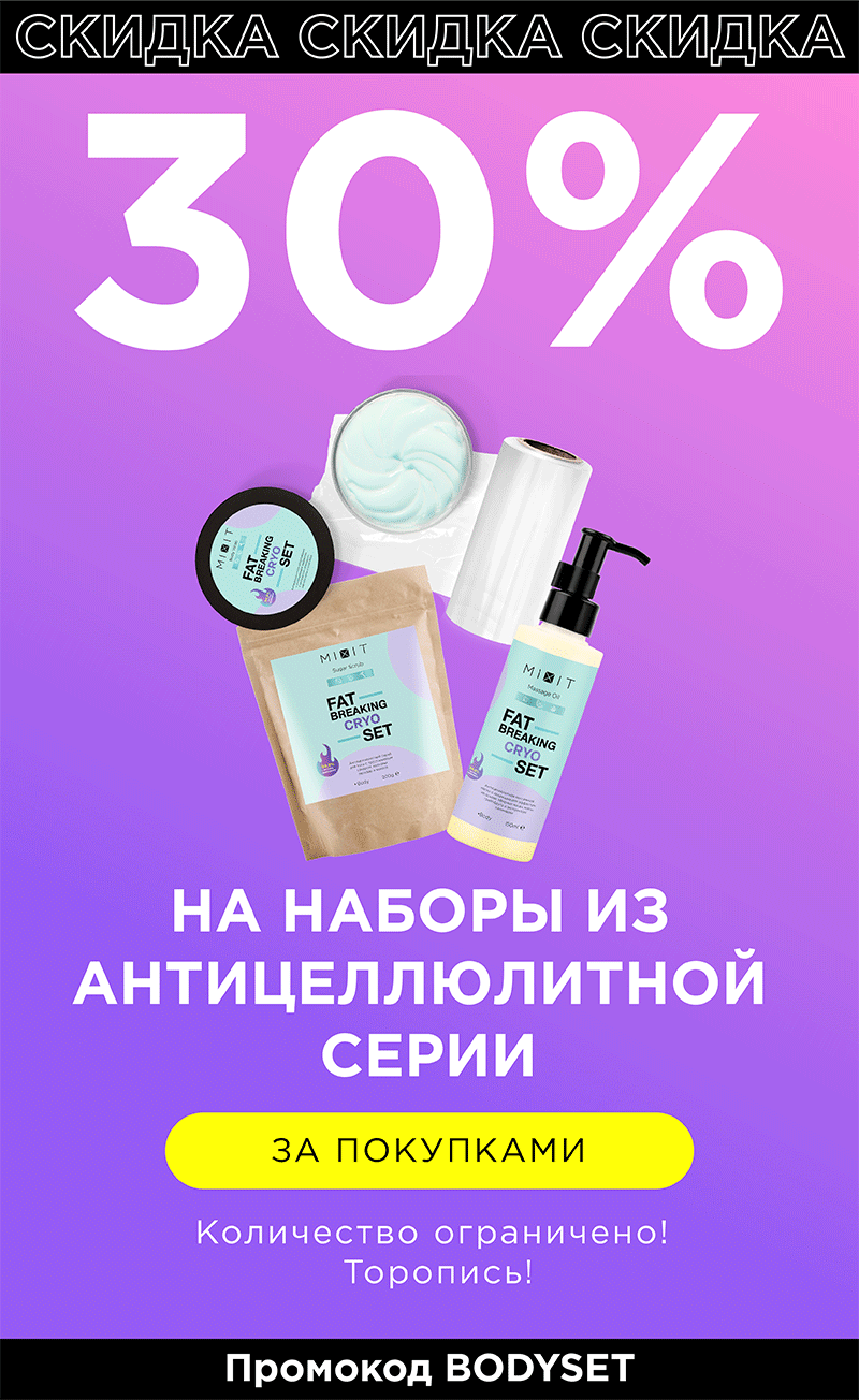 434 0 Условия акции: скидка -30% действует на наборы антицеллюлитной серии в интернет-магазине MIXIT. Промокод: BODYSETДействие акции: только 29.05.2020 до 23:59 по московскому времени. Перейти к покупке! 29.05.2020 Автор статьи: Мария Владимирова Поделиться с друзьями