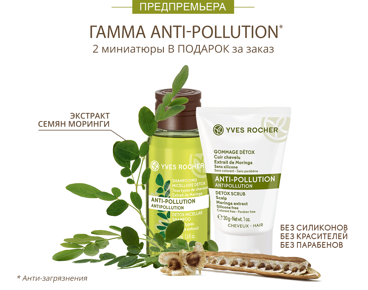Предложение "2 миниатюры гаммы Anti-pollution в подарок за любой заказ" действительно 18-19 июня в интернет-бутике Yves Rocher.