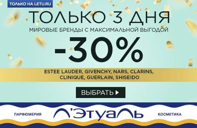 Условия акции: скидка -30% действует на следующие косметические бренды: Estee Lauder, Givenchy, Nars, Clarins, Burberry, Clinique, Guerlain, ShiseidoДействие акции: с 22.01.2017 по 24.01.2017Перейти к покупкам!*Подробнее об акции