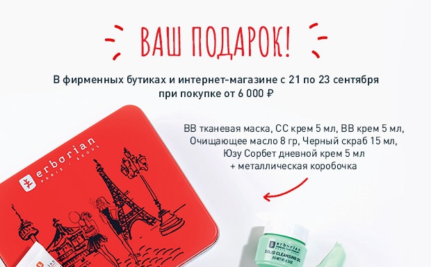 Условия акции: при покупке на сумму от 6000 рублей в интернет-магазине Erborian в подарок вы получаете металлическую коробочку, Очищающее масло 8 гр., ВВ крем Натурально-бежевый 5 мл, СС крем Совершенное сияние Cветлый 5 мл, Черный скраб для лица 15 мл, Юзу Сорбет Увлажняющий дневной крем 5 мл, BB тканевая маска 14 г. .Действие акции: с 21.09.2018 по 22.09.2018