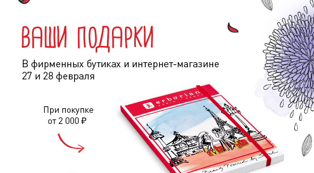 Условия акции:1) При заказе в интернет-магазине Erborian на сумму от 2000₽ вы получаете в подарок блокнот.2) При заказе в интернет-магазине Erborian на сумму от 6000₽ вы получаете в подарок 2 миниатюры:увлажняющий крем и лосьон.Действие акции: с 27.02.2018 по 28.02.2018Перейти к покупке!