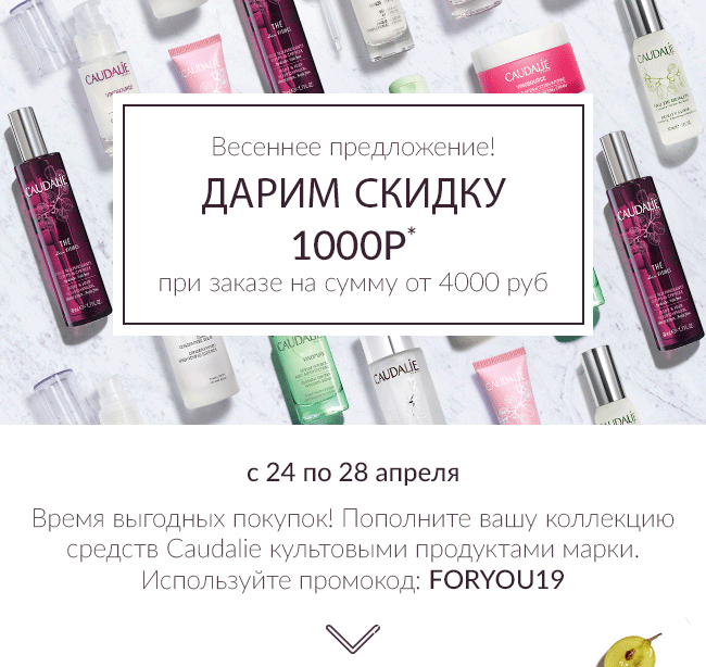 528 0 Условия акции: скидка на 1000₽ при покупке на сумму от 4000₽ в интернет-магазине Caudalie.Промокод: FORYOU19Действие акции: с 24.04.2019 по 28.04.2019Перейти к покупке! 01.05.2019 Автор статьи: Мария Владимирова Поделиться с друзьями