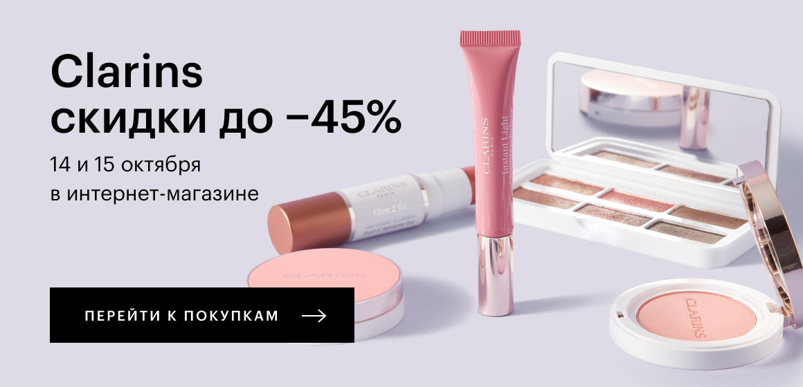Условия акции: скидки до -45% действует на весь ассортимент бренда Clarins в интернет-магазине Золотое Яблоко.Действие акции: с 14.10.2019 по 15.10.2019