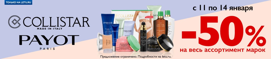 Условия акции: скидка -50% действует на весь ассортимент брендов Payot и Collistar в интернет-магазине Л'Этуаль.Действие акции: с 11.01.2019 по 14.01.2019Подробнее об акции.