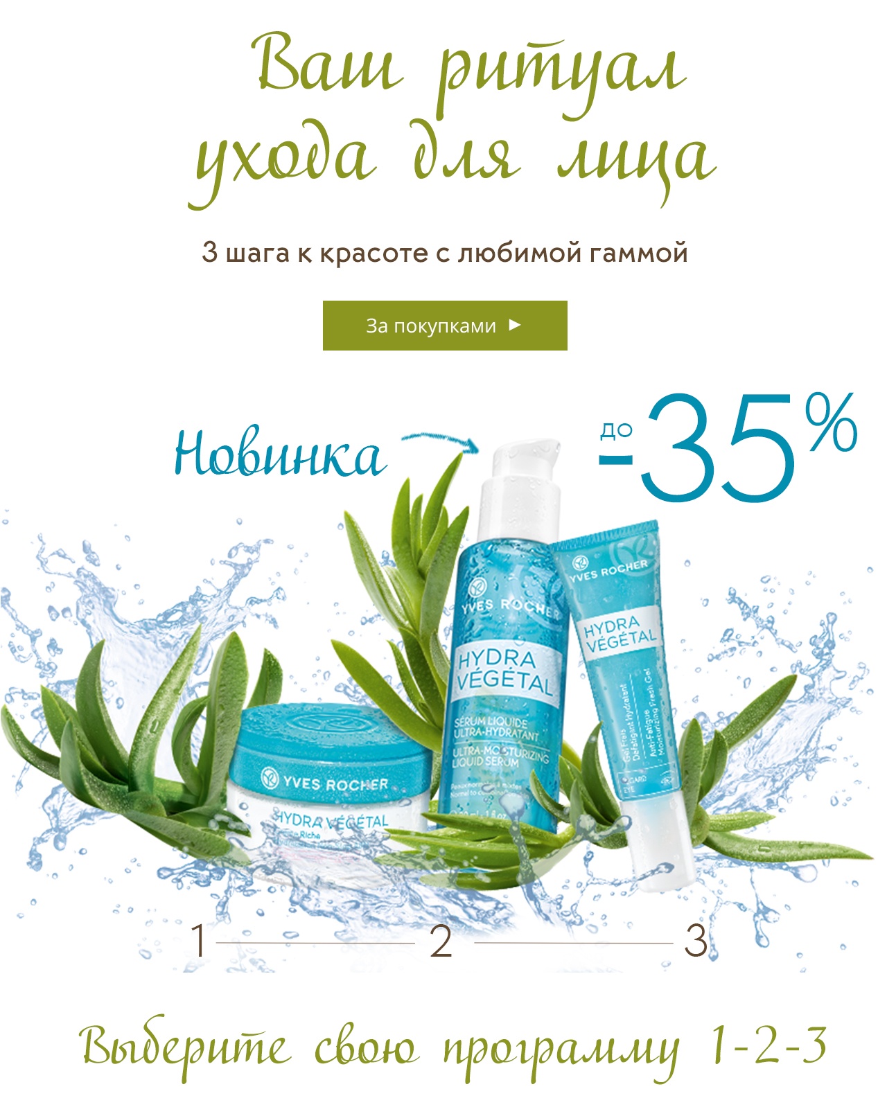 Предложения "Набор 1-2-3 со скидкой до -35%" и "Гоммаж для лица "Сияние и Увлажнение" со скидкой -42%" действительны до 12 августа 2018 г. в интернет-магазине Yves Rocher. Предложение "Подарки за любой заказ" действительно до 2 августа 2018 г.