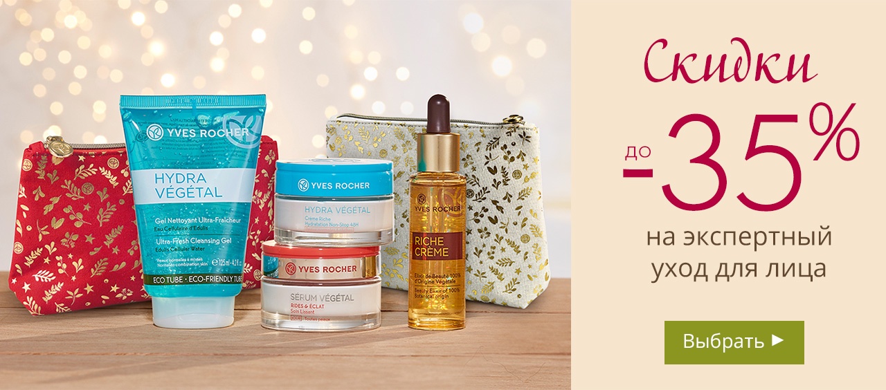 Предложения «До -35% на уход для лица» и «Бестселлеры макияжа от 189₽» действительны до 8 января 2019 г. в интернет-бутике Yves Rocher.