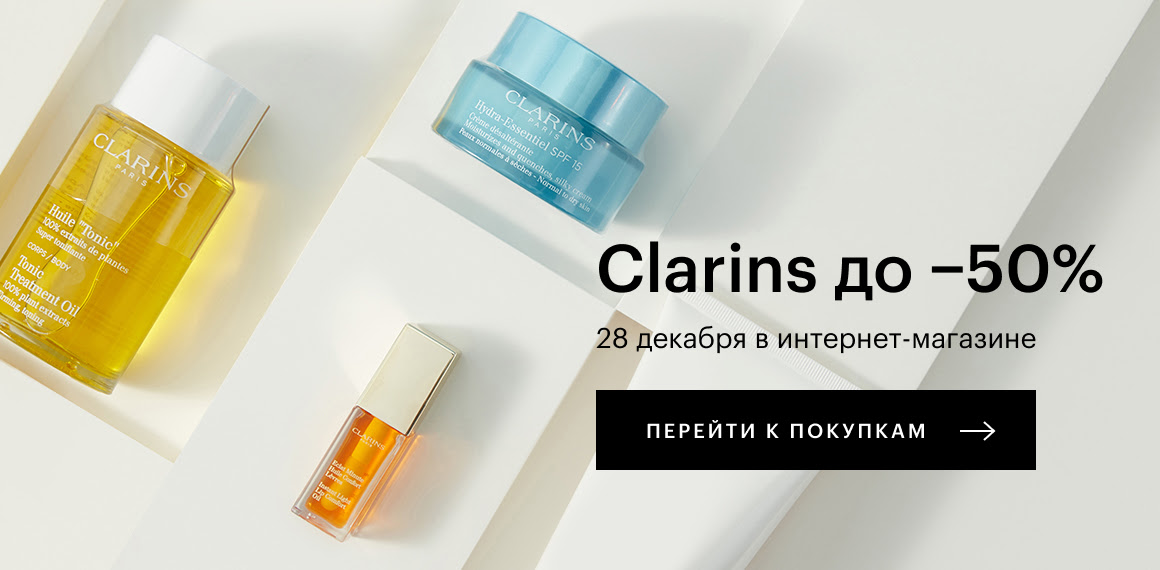 Условия акции: скидки до -50% на весь ассортимент бренда Clarins в интернет-магазине Золотое Яблоко.Действие акции: только 28.12.2019 до 23:59 по московскому времени.