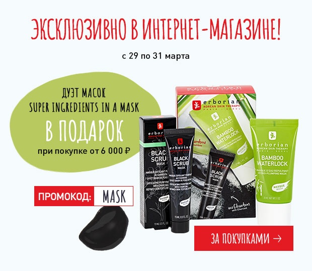 645 0 Условия акции: в подарок дуэт масок "SUPER INGREDIENTS IN A MASK" при покупке от 6000₽ в интернет-магазине Erborian.Промокод: MASK Действие акции: c 29.03.2019 по 32.03.2019 Перейти к покупке! 29.03.2019 Автор статьи: Мария Владимирова Поделиться с друзьями