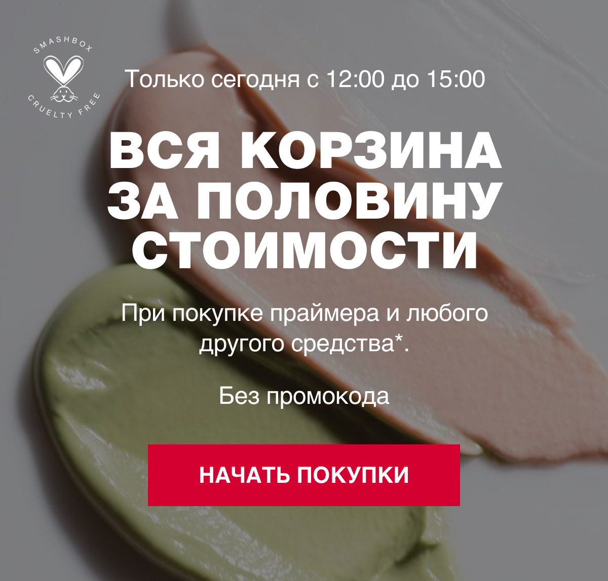 427 0 Условия акции: скидка -50% действует на всю корзину при покупке в интернет-магазине Smashbox. Действие акции: только 26.06.2020 с 12:00 до 15:00 по московскому времени. Перейти к покупке! 26.06.2020 Автор статьи: Мария Владимирова Поделиться с друзьями